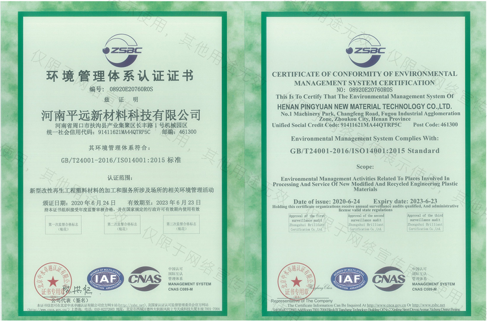 河南平遠新材料科技有限公司生產基地坐落于河南省鄢陵縣先進制造業開發區,工廠占地10000平方米。公司通過GRS全球回收標準認證、ISO9001質量體系、14001環境體系和45001職業健康安全管理體認證。華東分公司位于浙江省余姚市中國塑料城。